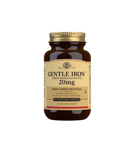 SOLGAR GENTLE IRON 20MG Solgar Jern 20 mg er sammensat af en unik formular, der er skånsom for maven. Jern bidrager til en normal kognitiv funktion, energistofskifte, normal funktion af immunforsvaret, normal ilttransport i kroppen, normal dannelse af røde blodlegemer og hæmoglobin. Jern bidrager til at mindske træthed og udmattelse. De vegetabilske kapsler er velegnet til veganere. Dosis og anvendelse 1 tablet dagligt - tages til måltidet. Anbefalet daglig dosis bør ikke overskrides. ...