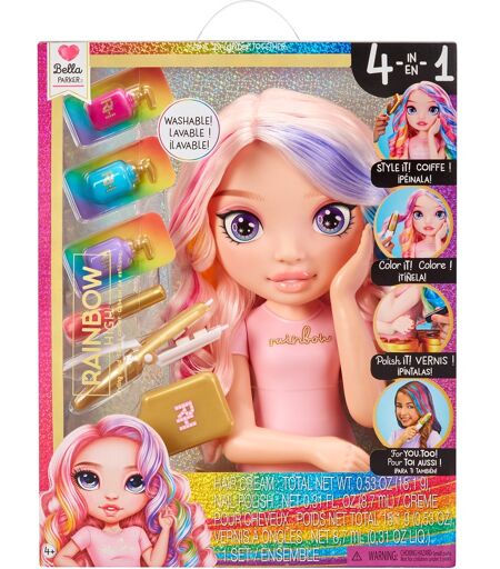 Rainbow HIgh Styling Head Playset er et ca. 33 cm højt stylinghoved af Rainbow Highs yndlingsfigur Bella - med 4-i-1 legemulighed! Den tilbyder langt hår til styling og kommer med stylingværktøjer såsom en hårbørste, 3 hårcremer, hårfarvningsapparat og neglelak. Maling af negle, styling eller farvning af hår – der er ingen grænser for din fantasi. Og det bedste ved det: det hele passer til dit eget hår eller negle! ...