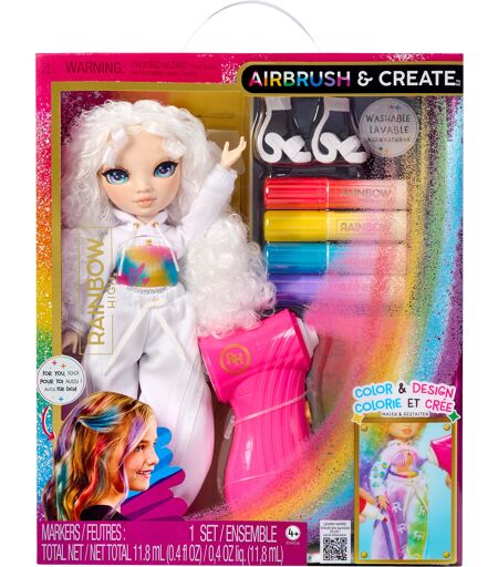 En ny figur træder ind i Rainbow High - i et smukt hvidt outfit med langt, hvidt hår. Med det innovative airbrush-værktøj kan individuelle farvedesigns påføres ubesværet. Alternativt kan de fire medfølgende tuscher i regnbuefarver bruges til at designe tøj, sko og hår. Farverne er vaskbare, så nye looks kan skabes igen og igen. En klistermærkeskabelon gør det nemmere at anvende figurer. ...