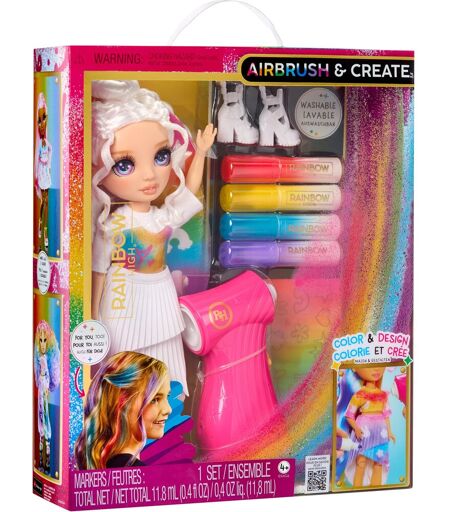 En ny figur træder ind i Rainbow High - i et smukt hvidt outfit med langt, hvidt hår. Med det innovative airbrush-værktøj kan individuelle farvedesigns påføres ubesværet. Alternativt kan de fire medfølgende tuscher i regnbuefarver bruges til at designe tøj, sko og hår. Farverne er vaskbare, så nye looks kan skabes igen og igen. En klistermærkeskabelon gør det nemmere at anvende figurer. ...