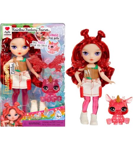 Rainbow High Littles er de små søstre til Rainbow High-figurerne - og som feer har de nu vinger! Hver dukke er omkring 14 centimeter høj og kommer med udskiftelige fevinger. Også inkluderet: Et flot, aftageligt outfit, kæmmbart hår og stilfulde sko. Og selvfølgelig har de hver deres kæledyr med sig. Apple Anderson dukker op i udtryksfuld rød - simpelthen sød! ...