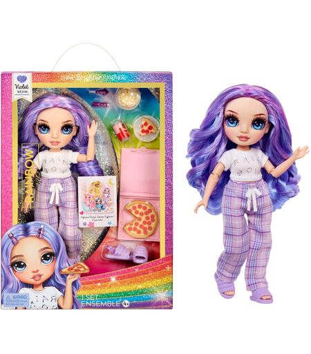 Drøm i lilla med Rainbow High Junior High PJ Party - Violet! For første gang inviterer vennerne af Rainbow High Junior High til en magisk slumrefest. Violet er perfekt klædt på til en aften med historier og sjov med sine plaidbukser med en blød skjorte og lilla hjemmesko. Hendes fortryllende ungdommelige ansigtsform, smukt krøllede, lange lilla hår, lange øjenvipper og glasagtige øjne gør Violet til et ægte blikfang. Med denne 23 cm høje modedukke kan børn slippe kreativiteten løs og skabe nye, fantasifulde historier, mens de leger. Bella og hendes tilbehør giver en masse sjove og sukkersøde drømme! ...