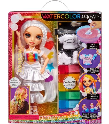Dukkerne fra Rainbow High Watercolor & Create-serien inviterer dig til at være kreativ! Med Watercolor og Create kan disse Rainbow High-dukker designes på mange forskellige måder – endda med tie-dye. De vaskbare farvestoffer kan endda bruges på dit eget hår. Derefter skal du bare skylle og gentage og gøre det hele igen. Udover den fuldt artikulerede dukke medfølger seks regnbuefarvede puddere, som kan bruges til at skabe akvareller i pink, orange, gul, grøn, blå og lilla. Den kommer også med elastikbånd til at skabe sjove tie-dye designs - spiraler, scrunch og meget mere. Stencilerne gør det nemt at skabe sjove former på håret og mode. Ud over dukken i et helt hvidt, tilpasseligt outfit (hættetrøje, plisseret nederdel og hvide high-top sneakers), er der en ekstra skjorte og sneakers. Fantastisk dukkesjov for kreative fra fire år og opefter! ...