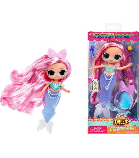 Fordyb dig i en magisk verden af magisk havfruesjov med L.O.L. Surprise Tweens Mermaids! - Lola Waves modedukke med blændende tilbehør til at pakke ud! Lola Waves er perfekt til badning og fantasifuld leg og vil tilføje en masse spænding med sin smukke farveskiftende hale og fascinerende finne, der kan bevæge sig frem og tilbage! Dyp din tweens havfruedukke i koldt vand, og se hendes hale skifte fra aquablå til perlelilla, hvilket skaber en magisk undervandsoplevelse. Denne frække tween kommer med masser af overraskelser med havfrue-tema, herunder mode, tilbehør og meget mere! ...