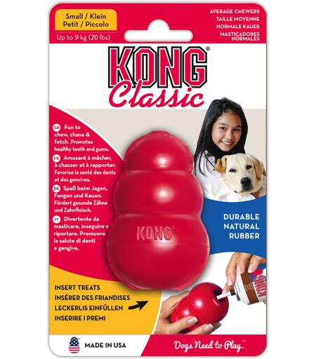 KONG Classic er en klassiker blandt hundelegetøjet. Dens specielle struktur gør den ideel til tygning og leg, og kan endda fyldes med godbidderHunde har en naturlig trang til at jage og tygge. Med KONG Classic giver du din firbenede ven et hundelegetøj, der har været populært i årtier og som er designet specielt til at tilfredsstille denne trang. Det klassiske KONG-produkt er lavet af rødt naturgummi med en behagelig tekstur, der ligefrem inviterer til gnave.KONG Classic egner sig perfekt til at fordrive kedsomhed og er et fantastisk apport-legetøj, når du er ude på gåtur i den friske luft. Det, der gør hundelegetøjet til noget helt særligt er, at den hopper og springer helt uforudsigeligt, hvilket yderligere stimulerer hundens jagt- og legeinstinkt og sikrer langvarig underholdning.Du kan også fylde KONG Classic med godbidder, som tyggeben og andre tyggesnacks. Når din hund har fanget KONG Classic, kan den få hundegodbidderne. Hundeejere fortæller, at deres hunde har brugt timer på at beskæftige sig med KONG classic. Så der er taget hånd om beskæftigelse, der appellerer til mange sanser.KONG Classic fås i mange forskellige størrelser - passende til både store og små hunderacer. KONG Classic i overblik:KONG hundelegetøj til voksne hunde.Springer og hopper helt uforudsigeligtFyld den med en lækker godbid F.eks. tyggeben og andre tyggesnacksTilfredsstiller den naturlig trang til at jage og tyggeFarve: rødMateriale: naturgummiStørrelsesoversigt: StørrelseMålEgnet til hunde på:XSca. H 5,7 x B 3,5 x T 3,5 cmOp til 2 kgMca. H 8,5 x B 5,5 x T 5,5 cm7 – 16 kgLca. H 10 x B 6,5 x T 6,5 cm13 – 30 kgXLca. H 13 x B 9 x T 9 cm27 - 41 kgXXLca. H 15,24 x B 9,86 x T 9,86 cm38+ kgBemærk:Som ved ethvert andet produkt skal du holde opsyn med dit kæledyr, når det leger med legetøjet. Tjek venligst produktet regelmæssigt for skader og udskift legetøjet, hvis det er beskadiget, eller hvis dele er blevet væk. Ellers kan dit kæledyr risikere at komme til skade.De passende KONG Snacks finder du her:Chewies Små Tyggeben (semi-moist)RINTI Extra Bits ...