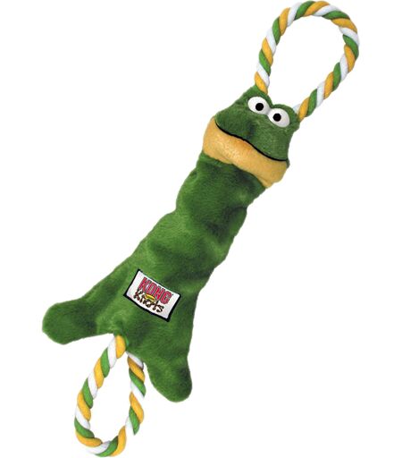 Elsker din hund at lege vildt og prøve kræfter, når I leger? Dette kvalitets-legetøj fra KONG er et fremragende valg til lange ruskelege. Hundelegetøj har en dejlig, blød overflade lavet af bomuldsfibre og er udstyret med et reb på begge sider. Hvad knirker og holder til selv den vildeste af styrkeprøve? KONG Tugger Knots Frø! Den er lavet af robuste materialer og er derfor meget stabil. De flettede reb-ender er nemme at få fat i og er bundet sammen inden i frøkroppen. Derfor sidder løkkerne virkelig godt fast og kan ikke trækkes ud under legen. Med sin bløde overflade af bomuldsfibre kan den søde frø også bruges til at hygge og putte med, når din vovse er træt og udmattet efter en anstrengende leg. KONG Tugger Knots Frø har en squeaker i den nederste del af frøen og vækker din hunds opmærksomhed med pibende lyde. Det gør det ekstra sjovt at lege. Die KONG Tugger Knots Frø i overblik: Robust hundelegetøj –til at lege med, trække i, og kramme Med tov og løkker i begge ender Knyttede tov Med squeaker: larmer når der leges Blød overflade, perfekt til krammere Farve: grøn / gul Materiale: bomuldsfibre Størrelse: Længde: ca. 33 cm Diameter reb: 1 cm Vægt: ca. 165 g OBS: Som med alle andre produkter bør du holde øje med din hund, når den leger med legetøjet. Check regelmæssigt legetøjet for skader og skift det ud, hvis det er defekt eller har mistet en bestanddel, da man ellers ikke kan udelukke, at din hund kommer til skade. ...