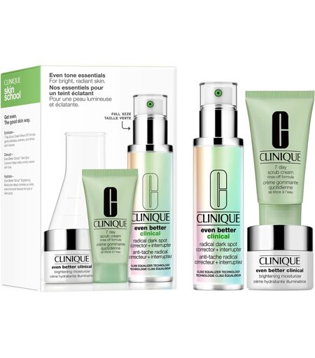 Clinique Uneven Skin Tone Set (Limited Edition) er et fantastisk sæt, der har til formål at lysne huden, og give en mere jævn og ensartet finish. Sættet indeholder: 1 stk. Clinique Even Better Clinical Brightening Moisturizer 1 stk. Clinique 7 Day Scrub Cream Rinse-Off Formula 30 ml 1 stk. Clinique Even Better Clinical Radical Dark Spot Corrector + Interrupter 50 ml ...