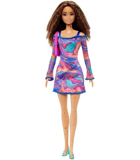 Dukkerne i Barbie Fashionistas-serien afspejler nutidens verden og bærer prangende og trendy outfits. Denne Barbie dukke har masser af yndige fregner og creperet, brunt hår. Den lilla skuldertaske og grønne muldyr fremhæver hendes venlige personlighed. Smukke koraller og blå kurver dekorerer hendes kjole i et marmor-regnbue look. De faldne meshærmer fuldender det groovy outfit. Med sit alsidige look er denne dukke klar til en masse eventyr. ...