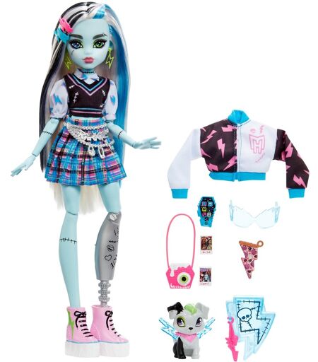 Skolen er startet igen, og ghouls fra Monster High dukker op i deres hvinende stil! Frankie Stein-dukken spankulerer gennem gangene på Monster High på elektrificerende vis med en plaidnederdel, en bluse med lynprint og en vest med stingdetaljer. Hendes fabelagtigt freaky look suppleres med chunky platform sneakers, uhyggeligt tilbehør og et proteseben samt stingdetaljer, der fejrer hendes unikke stil. Frankie Stein-dukkelooket når nye horisonter med en Voltageous college-jakke og elektrificerende tilbehør. Og hendes uhyggelige søde kæledyrshund, Watzie, inspirerer til uhyggelig historiefortælling! ...