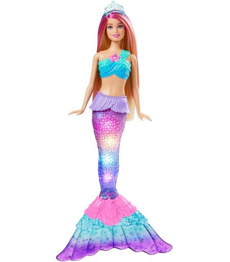 Dyk ned i fantasien og fine fortællinger med Barbie™ Dreamtopia Twinkle Lights Mermaid™-dukken med magisk lysfunktion. Dyp den smukke Barbie®-havfruedukke i vand for at se hendes perlemorsskinnende hale glimte i et af fire mulige farvestrålende lysshows. Barbie™ Dreamtopia Twinkle Lights Mermaid™-dukken gør lykke i badekarret eller poolen, men børnene kan også more sig på land -- tryk på den stjerneformede knap på Barbie®-dukkens dragt for at se lysshowet uden vand. Regnbuefinner, lyserøde striber i håret og et prinsessediadem fuldender Barbie®-dukkens farverige havfruelook. Perfekt til badetid og vandleg (kræver voksent opsyn) – Barbie™ Dreamtopia Twinkle Lights Mermaid™-dukken er en fantastisk gave til børn i alderen 3 til 7. Dukkerne kan ikke svømme eller stå af sig selv. Farver og mønstre kan variere. ...
