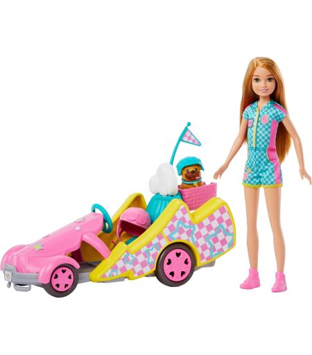Stacie giver den fuld gas med dette Barbie-legesæt: Med sine rullende hjul, smarte terndesign, aftagelige flag og hvalpekurv ser denne kart ud, som om den kom lige ud af animationsfilmen "Barbie og Stacie til undsætning". Poochkurven fastgøres bag på køretøjet, så Stacies pooch også kan ride sammen. Stacie-dukken kommer i et smart raceroutfit med en lyserød hjelm. Valpesikkerhed sikres også med en lyserød hjelm. ...