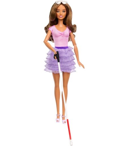 De forskellige dukker fra Barbie-fashionistaerne afspejler verden af i dag og inspirerer med lyse og trendy outfits, som der ikke er nogen grænser for fantasien med. I samarbejde med American Foundation for the Blind har Barbie udviklet en dukke, der realistisk skildrer blinde eller mennesker med svært nedsat syn. Hendes lyserøde satinbluse og glitrende nederdel med flæser er lavet af behageligt materiale. De lavendelfarvede sko med stropper med hæle tilføjer et cool og stilfuldt touch til dit søde outfit. De farverige og kontrasterende lukninger på bagsiden af hendes top og på linningen af hendes nederdel gør det nemt at klæde Barbie-dukken på. Dine sølvfarvede pilotsolbriller er ikke kun ret seje, men også praktiske! Linserne beskytter dine øjne mod UV-stråler fra sollys. Når Barbie er ude i byen, bruger hun sin stok. Dette er et vigtigt tilbehør til hendes outfit, som hun altid er velklædt på med både om dagen og om aftenen, og som er perfekt til en sjov weekend med vennerne! Det ekstremt kærlige design af den blinde fashionistas-dukke er blandt andet tydeligt i de bevægelige arme, hvormed stokken er en leg, samt i inskriptionen "Barbie" i blindskrift på emballagen. ...