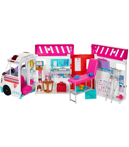 Med dette Barbie 2-i-1 ambulancelegesæt er ambulancen altid klar i en nødsituation! 2-i-1 ambulancen kan omdannes fra en ambulance med lys og lyde til et lægekontor med undersøgelsesrum, undersøgelsesbord, reception og venteværelse. Håbefulde læger og sygeplejersker kan komme med alle slags medicinske historier med de mere end 20 tilbehør. Tilbehør omfatter et højdejusterbart undersøgelsesbord, krykker, røntgenstråler, et stetoskop og meget mere. ...