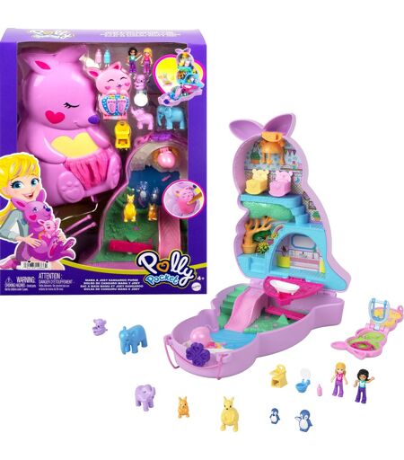 Med denne legetaske fra Polly Pockets verden kan legetøj nemt tages med. 2-i-1-legesættet har en kænguruform og en blød pose foran, der passer til den lille kasse. På børneværelset finder dyreungerne et sted at lege, der er også en plejestation, en rutsjebane, en vippe og en legeplads med gynge. Sættet indeholder hoppesenge og flasker. Der medfølger også to små dukker, syv dyr og tilbehør, hvoraf nogle er til at stikke og bytte. Efter afspilning kan sættet simpelthen lukkes med alle dele i det. Med skulderremmen kan den også bæres som skuldertaske. ...