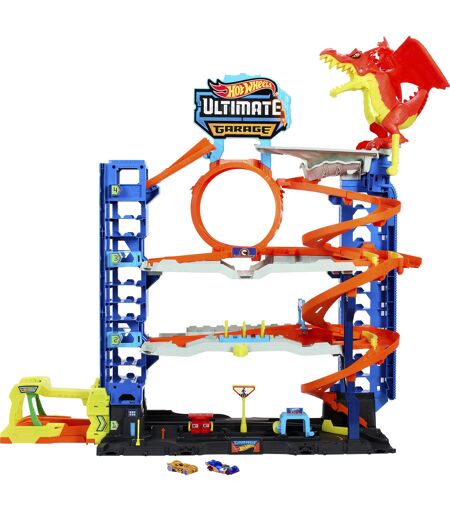 Hot Wheels City Ultimate Garage byder på racersjov og action på fire niveauer. Hvert niveau inspirerer til racereventyr såsom head-to-head løb, looping stunts og en episk kamp mod den bilædende drage. Sættet indeholder to Hot Wheels-køretøjer og tilbyder rigelig parkering til mere end 50 legetøjsbiler i målestoksforholdet 1:64. Det kan også kombineres med andre sæt for at bygge en hel Hot Wheels City. Yderligere sæt sælges separat. Hot Wheels Ultimate Garage i flere niveauer byder på racersjov, stunteventyr og endda kampe med en drage. På første niveau er der racerbanedetaljer såsom slanger, en bilvask med skumrulle og vognbaneskiftere og stik til at forbinde andre sæt til en endnu større Hot Wheels City. (Yderligere sæt sælges separat.) Elevatoren, der har plads til 2 biler, fører til næste niveau, hvor de to Hot Wheels-biler, der indgår i leveringsomfanget, kan starte et head-to-head løb direkte fra elevatoren. På tredje niveau kan to køretøjer konkurrere mod hinanden i en løkke, og vognbaneskifterne kan bruges til at variere deres målstreg. En bilædende drage venter på fjerde niveau. Hvis han ikke besejres, vil Hot Wheels blive fortæret nådesløst. De spiste biler kommer ud gennem dragens bagende, og dragen falder til jorden. ...