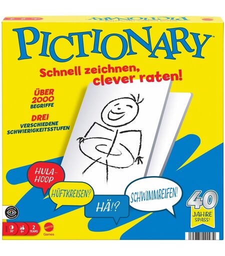 Hurtig tegning og endnu hurtigere gæt - det er familiens brætspil Pictionary fra Mattel! I dette sjove spil for afslappede spillere skiftes et holdmedlem til at tegne et udtryk, og resten af holdet gætter. Spillere kan vælge mellem tre forskellige sværhedsgrader, så selv yngre spillere nemt kan deltage. Tegnefærdigheder er ikke påkrævet, og gætteforsøgene er nogle gange meget sjovere end tegningerne. ...