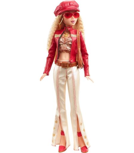 Mattels My Scene-dukker er tilbage og mere moderigtige end nogensinde! My Scene Madison, Barbie og Chelsea bringer endnu en gang venskab, mode og sjov til storbyen i denne nostalgiske kollektion. Disse bedste venner optrådte på blogs, webisoder og endda på det store lærred fra 2002 til 2009 og fortryllede børn i de tidlige nittisere med deres unikke stil og smittende personligheder. Nu er de igen i rampelyset med friske outfits inspireret af deres originale looks! Denne Barbie-dukke skiller sig ud i et rødt og cremefarvet outfit. En skinnende rød motorcykeljakke afslører en kort overdel nedenunder og supplerer de udvidede bukser med en slids. Ved årtusindskiftet suppleres dette outfit med en ballonkasket i imiteret læder, tonede solbriller, en sadeltaske, et matchende bælte og røde hæle med blokhæle. Bølget blondt hår med crepe-accenter understreger hendes ansigtsform. I den super søde emballage til at vise frem, ser denne dukke bare fantastisk ud! ...