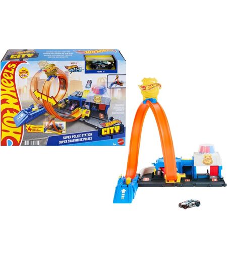 Takket være den tilpasselige racerbane tilbyder Hot Wheels City Super Police Station fire forskellige racer- og stuntmuligheder. Den trykstøbte legetøjspolitibil, der er inkluderet i leveringsomfanget, kan først køre ind i starteren. Der kan bilen "tankes" ved en benzinpumpe med en bevægelig slange - nu er det tid til at komme på banen! Racerbanen kan skubbes ind i en af fire positioner med looping - så forskellige stunts eller et forskelligt resultat vælges i hvert enkelt tilfælde. Der kan parkeres op til fire køretøjer på sættet, som kan kombineres med andre baner og legesæt, der sælges separat for ekstra sjov. En bil er inkluderet i leveringsomfanget af dette sæt. ...