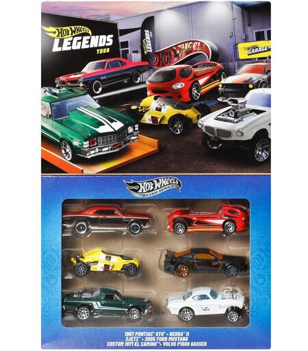 Dette sæt med seks legetøjsbiler indeholder 6 legetøjskøretøjer, der har opnået legendarisk status i Hot Wheels-historien. Bilerne kommer i skala 1:64, er hver lavet udelukkende af metal og indeholder specielle dekorationer, der gør dem interessante for samlere. Den inkluderer en Pontiac GTO fra 1967, en Deora II, en 2Jetz, en Ford Mustang fra 2005, en Custom 1971 El Camino og en Volvo P1800 Gasser. ...