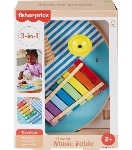 Træbordet fra Fisher-Price inviterer småbørn fra 2 år til at opdage lydenes forunderlige verden. Fra det første blide tryk på xylofonen, til de glade bækkenslag til den rytmiske skralde af guiro - børn finder deres egen rytme og styrker legende deres finmotorik og øje-hånd-koordination. Spillebordet er lavet af FSC-certificeret træ og står for holdbarhed og er samtidig godt for miljøet. Med hvert slag på slagtøjsinstrumenterne fremmes ikke kun rytmesansen, men også en inspirerende rejse gennem melodi og lyd begynder. Dette legetøj indeholder et robust musikbord i træ og to børnevenlige hamre - et legetøj, der inviterer jer til at lave familiemusik sammen og får børns hjerter til at slå hurtigere. ...