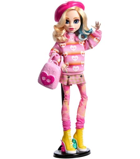 Dukkerne fra Monster High Wednesday-kollektionen er en hyldest til den verdensberømte serie "Wednesday". Denne Enid Sinclair-dukke genfortolker Wednesdays sprudlende værelseskammerat og hendes livlige stil gennem Monster High-brillerne. Enid blander mønstre med en stribet rullekrave, ternet nederdel, marmorerede strømpebukser og oprullede benvarmere. Gule sneakers med bløde legetøjshæle er en hilsen til indretningen af hendes værelse. Med sit fremhævede hår og sine farverige, udstrakte kløer ser hun præcis ud som i serien. Matchende tilbehør som en lyserød baret og en rygsæk med pelskant fuldender hendes look. ...