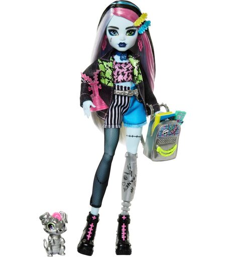 Træd ind i den elektrificerende verden i Monster High med Frankie Stein-dukken og hendes trofaste hvalp Watzie! Som datter af Frankenstein-monsteret giver Frankie udtrykket "spooktacular" en helt ny betydning med sit moderigtige look. Hendes ikoniske denimjakke er parret med sammenslyngede shorts og skinnende sorte støvler. I overensstemmelse med sin elektrificerende karakter bærer Frankie store lynøreringe. Watzie, hendes metalliske glitrende hundeven, er klar til legende drengestreger af alle slags. Sættet indeholder ekstra tilbehør til spændende eventyr: en rygsæk i sølv, en skør videnskabelig notesbog, et bæger til at brygge hemmelige formler, en lynberegner, seje solbriller, frokost på farten og en forfriskende juice til pauserne. ...