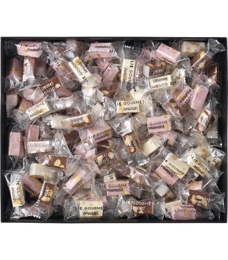 Eksklusiv gaveæske med fransk nougat Glæd en med denne eksklusive gaveæske fyldt med lækre stykker af autentisk fransk nougat, af de bedste nougatvarianter: mandel, chokolade og hindbær. Hver nougatbid er individuelt indpakket i praktisk flowpack, som sikrer friskhed og nem servering. Nougaten er desuden både gluten- og laktosefri, så den kan nydes af mange. Vægt: 1 kg (ca. 120 stk.) 3 smagsvarianter: Mandler, chokolade og hindbær ...