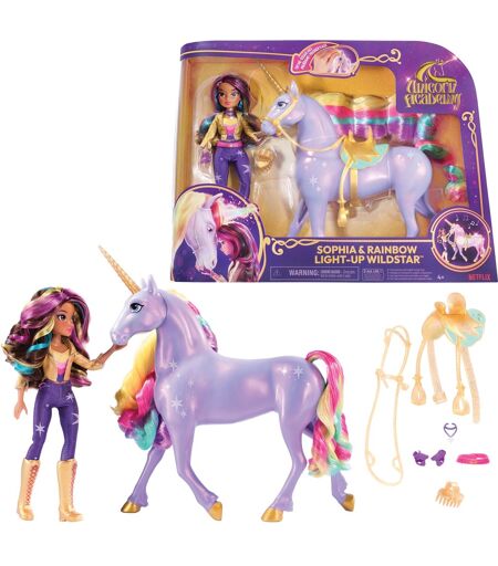 Tag til Unicorn Academy med Spin Masters figurer! I overensstemmelse med Netflix-serien kommer seriens enhjørninger også til live som karakterer. Wildstar er Sophias enhjørning og står for lysmagi. Denne enhjørningefigur har interaktive elementer: Når enhjørningen stryges eller trækkes i tøjlerne, klirrer hovene, og enhjørningen begynder at gløde blødt i regnbuens farver. Hornet skinner, når det berøres, og seriens titelsang "Hör auf dein Herz" spilles på tysk, engelsk eller fransk. Dette sæt indeholder også den cirka 28 centimeter høje udklædningsdukke Sophia med hendes typiske ridetøj. Dukken er bevægelig og kan derfor sidde i enhjørningens aftagelige sadel. ...