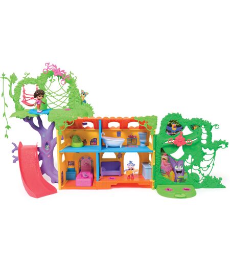 Spin Master præsenterer et dukkehuslegesæt af en særlig slags: Med Dora, den livlige heltinde fra den animerede tv-serie af samme navn, bliver livet i regnskoven levende. Derfor er Casita-legesættet, Doras hjem, beliggende i frodige grønne områder med lianer til at gynge og klatre. Det er her, Dora og hendes abeven Boots er i deres rette element. En rutsjebane, dansegulv og meget mere giver også en masse sjov. Legesættet byder på 15 lydeffekter og to sange fra serien. Sproget kan indstilles enten på tysk eller italiensk. Husets værelser kan indrettes på forskellige måder med det omfattende tilbehør og dekoreres med klistermærker. Sættet er kompatibelt med de forskellige figurpakker, der sælges separat, så Dora kan invitere alle sine venner. ...