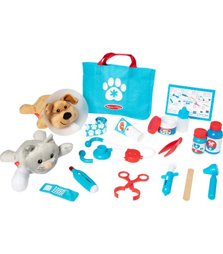 Dette dyrlægesæt fra Spin Master Melissa & Doug introducerer børn til lægeundersøgelser og til at tage ansvar for et kæledyr på en legende måde. Rollelegesættet med 24 dele indeholder en plyshund og en plyskat samt talrige instrumenter og tilbehør. Inkluderet er et stetoskop, termometer, sprøjte, otoskop, pincet, spatel, bandage, plaster, medicinkrukke og lotionflaske samt et dobbeltsidet, genanvendeligt behandlingskort. Når sættet ikke er i brug, kan det nemt opbevares i den medfølgende lægetaske. ...