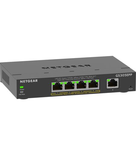Netgear 5-Port Gigabit Ethernet High-Power PoE+ Plus Switch (GS305EPP) Administreret L2/L3 Gigabit Ethernet (10/100/1000) Strøm over Ethernet (PoE) Sort