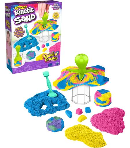 Med Kinetic Sand Squish N'' Create Set er der ingen grænser for kreativitet. Dette sæt indeholder alt, hvad du behøver for at bringe kinetisk sand til live med alle dets særlige egenskaber. Kinetisk sand flyder magisk gennem hænderne, kan vidunderligt blandes, formes, skæres og æltes. Ved at blande de tre forskellige farver blå, pink og gul skabes de smukkeste regnbuefarver, som bliver til flotte mønstre ved hjælp af de fem værktøjer. Med puncheren kan forskellige former skæres ud af forskellige sandfarver og derefter stables kreativt i den ottekantede kop. Klem derefter med støderen og drej ud af koppen for at opdage overraskende mønstre. Efter formning er før du lader det flyde, for at opleve et sandt optøjer af farve. På grund af sin kornede fornemmelse tilbyder Kinetic Sand en fascinerende taktil oplevelse, der ikke kun bringer glæde til børn og også har en afslappende effekt. Da kinetisk sand ikke tørrer ud, kan det bruges igen og igen. Hvis du leder efter en forsyning af Kinetic Sand i nye friske farver eller med glitter, finder du det i 907 g poserne (sælges separat). Mere sand betyder endnu flere kreative muligheder, hvor husholdningsartikler også kan bruges som værktøj. Eksperimentering med kinetisk sand opfordres udtrykkeligt. Da Kinetic Sand holder sig til sig selv og ikke til hænderne, er det ikke et problem at rydde op efter leg. Opbevar blot Kinetic Sand i en forseglbar beholder indtil næste leg. Kinetisk sand er fremstillet i Sverige og er fri for gluten, hvede og kasein, hvilket gør det velegnet til allergikere. ...