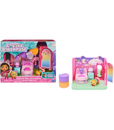 Spin Master''s DreamWorks Gabby''s Dollhouse legetøj fordyber førskolebørn i den katte-tastiske verden i den populære animerede serie Gabby''s Dollhouse. Med det detaljerede soveværelse til luksusværelset med kattefiguren Pillow Cat kan seriens magiske eventyr genopføres autentisk. Dette deluxe-værelse er fuld af kærlige detaljer og overraskelser at opdage. Ud over kattefiguren Pillow Cat, der minder om en kælen pude, soveværelsesmøblerne og kærligt indretningstilbehør, indeholder hvert deluxe-værelsessæt to dukkehusoverraskelseskasser. Ligesom Gabby i begyndelsen af hver episode kan leveringspakkerne åbnes for at opdage det mystiske tilbehør til sættet. Cuddly cat Pillow Cat tog sovemasken på i sit fantastisk søde værelse og lagde den i seng med kattens kælne legetøj. Hvis du trykker på sengen, forvandles bogreolen for enden af sengen til et lille drømmelandskab, der matcher tapetet. I dette detaljerede rum med dets mange funktioner kan børn lade fantasien få frit løb for magiske øjeblikke derhjemme. ...