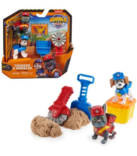 Konstruktionspoterne er her! Rubble Fætter Wheeler og Charger kan næsten ikke vente: Små byggefans kan genskabe spændende eventyr med de to seriehelte eller gennemføre deres egne projekter med værktøjerne. Skovlen gør det nemt at skovle og flade den medfølgende Kinetic Sand Build-It-Sand. Vinkelsliberen hjælper med at skære og forme byggeklodser. Kinetic Sand Build-it Sand klæber til sig selv: det kan øses, æltes og presses efter ønske. Det magiske sand kan formes igen og igen og arbejdes videre med byggelegetøjet. Efter at have spillet finder sandet sin plads i den genlukkelige beholder på ingen tid overhovedet. ...