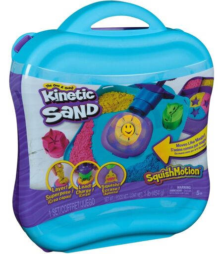 Kinetic Sand åbner op for en kreativ og fantasifuld indendørs sandlegeverden: formbart og fascinerende, dette legesand glider gennem dine hænder og tørrer aldrig ud, så det er klar til at spille når som helst. Da Kinetic Sand klæber til sig selv, forbliver hænderne rene, og oprydning sker også hurtigt. Den kornede fornemmelse af Kinetic Sand giver ikke kun en ægte sandfølelse, men fremmer også udviklingen af følesansen. Med Squishy Fun Set får legen med det magiske sand en helt ny dimension. Her kommer sandkreationerne til live på en ny måde og ændrer sig for øjnene af dig selv! Først er sandet lagdelt - forskellige farver giver gode effekter. Sættet indeholder farverne blå, pink og gul, så forskellige nuancer kan blandes. Når sandet er glattet med skæreværktøjet, vælges en stempelfastgørelse. Særligt populær: den lille haj. Tilbehøret fastgøres til stempelværktøjet, sandet skæres ud med det og presses ned på den bløde spilleflade. Nu skal du blot slippe sandkreationen fra værktøjet og se den udvide sig og komme til live, mens spillefladen buer opad. Hajen åbner for eksempel sin lille mund! ...