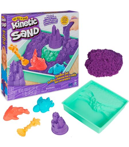 Kinetic Sand åbner op for en kreativ og fantasifuld indendørs sandlegeverden: Dette legesand er formbart og fascinerende, glider gennem hænderne og tørrer aldrig ud, så det er klar til leg når som helst. Da Kinetic Sand klæber til sig selv, forbliver dine hænder rene, og oprydning sker også hurtigt. Dette sæt indeholder i alt 454 gram sand i farven lilla. Derudover er der en sandkasse med forskellige niveauer og tre forme: Med haj, skildpadde, et lille slot og skalskovlen kan der skabes søde små undervandsverdener. ...