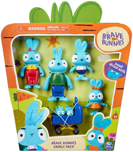Brave Bunnies er kendt fra tv-serien "Brave Bunnies - Hasenbande unterwegs" på SUPER RTL. Kaninbørnene Bop og Boo er søskende og oplever mange eventyr med deres kaninfamilie og deres venner, de bedste kaninvenner. Med familiepakken kan børn nu også genopføre eventyrene derhjemme og have hele familien som legefigurer. Dette actionfigurgavesæt indeholder den elskelige Bunny Bop og hans legesyge søster Boo samt Ma, Pa og de søde kaninbabyer. Babyerne sidder i en blå klapvogn med funktionelle hjul. Figurerne kan bevæge arme, ben og hoved og forbindes til tilbehøret ved hjælp af hak på hænder og fødder og gribe fat i klapvognen. Kaninerne vrikker med ørerne, og babyerne hopper op og ned i børnenes dag. Emballagen indeholder en yderligere overraskelse: Efter udpakning af figurerne kan pap udfoldes og bruges som farvelægningsside. Ud over familiesættet på 5 er der også de mindre grundfigursæt med 3 med 1 kaninbarn, 1 dyreelsker og 1 tilbehør (malerpakke med lærred, skateboardpakke med skateboard, skattejagtpakke med skattekiste) - sælges separat. Velegnet til børn fra 3 år. ...