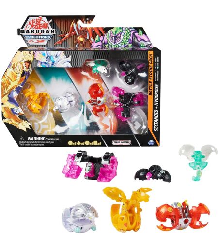 Bakugan Evolutions Battle Strike 6 Pack tilbyder en helt ny kampoplevelse! Fordi den ikke kun indeholder tre Bakugan-bolde, men også to nye Nanogan og en Geogan til overraskelsesangreb i kamp med venner. En af Bakugan kuglerne er også en Platinum Series Bakugan med metalkerne, som har en større vægt og derfor mere kraft. Dette kan forårsage større skade på modstanderen. Men hvis modstanderens Bakugan er stærkere, kan et overraskelsesangreb med den nye Nanogan lanceres en gang pr. Rulleduel (dvs. 3 gange i hele kampen). Nanogan er mini-Bakugan, som ikke åbner via en integreret magnetisk mekanisme, men skal foldes ud i hånden. Den ekstra B-kraft kan derefter føjes til en Bakugan. Alternativt kan Geogan bruges: Geogan kan bruges som tagteam-partner som i brydning. Den uhæmmede kraft i en Evolution Bakugan-bold bliver synlig, når den rulles over en af de medfølgende BakuCores og omdannes til en detaljeret handlingsfigur i brøkdele af et sekund. Uanset om det er en helt ny eller en af de populære figurer som Dragonoid, Trox eller Nillious: Bakugan ligner ekstremt deres forbilleder fra den animerede serie. Da det ikke kun handler om Udseendet af Bakugan, men frem for alt om Bakugan-spillernes rullende færdigheder, tilbyder Bakugan med portalkortene (inkluderet) nok øvelsesmulighed. ...