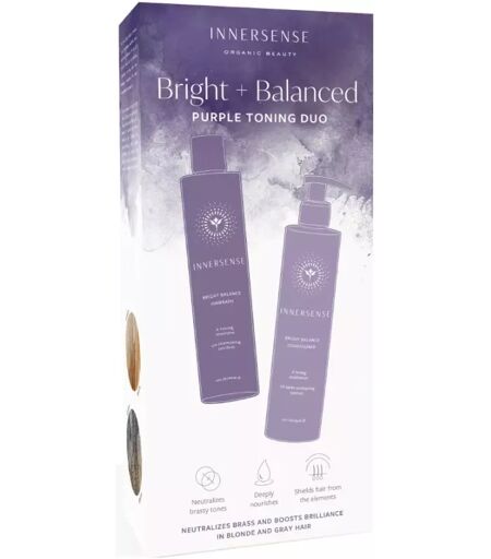Innersense Bright + Balanced Purple Toning Duo Set er det perfekte sæt til dig, der ønsker at holde dit blonde hår lysere, koldere og sundere i længere tid. Denne pakke byder nemlig på en fantastisk silvershampoo -og conditioner, som neutralisere gyldne toner, samtidig med at de fugter håret i dybden, blødgør og minimerer krus. Vedligehold hårfarvens levetid og optimer den generelle hårsundhed med Innersense Bright + Balanced Purple Toning Duo Set. Sættet indeholder: 1 stk. Innersense Bright Balance Hairbath 295 ml 1 stk. Innersense Bright Balance Conditioner 295 ml ...