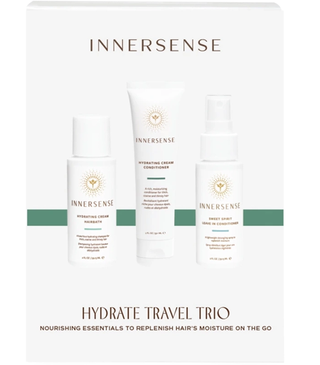 Innersense Hydrate Travel Trio er en lille sampak af skønne produkter fra Innersense Organic Beauty i praktiske rejsestørrelser, til eksklusiv pleje af dit hår. Mærk hvordan dit hår forkæles og plejes i dybden, samtidig med at håret blødgøres og fugtes, og efterlades med den smukkeste glans. Pakken indeholder: 1 stk. Innersense Hydrating Cream Hairbath 59 ml 1 stk. Innersense Hydrating Cream Conditioner 59 ml 1 stk. Innersense Sweet Spirit Leave-In Conditioner 59 ml Innersense Hydrating Cream Hairbath er en fugtgivende og styrkende ”Low-poo” shampoo, som egner sig godt til et tykt og tørstigt hår, samt et hår med mange krøller. Denne luksuriøse shampoo er beriget med essentielle olier fra salvie og tamanu, som skånsomt renser hår og hovedbund uden at håret mister dets naturlige olier. Se fuld beskrivelse her Hydrating Cream Conditioner er en fugtgivende og blødgørende balsam, som egner sig godt til et tykt og tørstigt hår, samt et hår med mange krøller. Denne cremede balsam er beriget med monoiolie samt aloe vera, som styrker håret og giver kontrol over ustyrlige lokker, mens indholdet af appelsinblomstolie giver dit hår en smuk glans. Se fuld beskrivelse her Innersense Sweet Spirit Leave-In Conditioner er en let, fugtgivende balsamspray, som kan bruges af alle hårtyper. Denne skønne spray er beriget med blødgørende olier og honning, samt duftende urter og blomsteressenser, som alle er med til at bevare fylde, og gøre dit hår mere medgørligt. Se fuld beskrivelse her ...