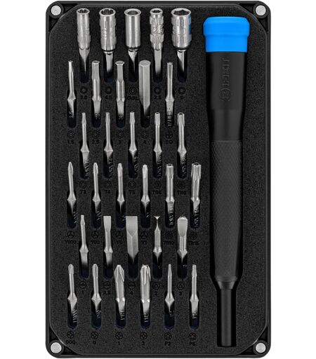 Moray Precision Bit Set EU145475-1 fra iFixit tilbyder omfattende udstyr til alt skruearbejde, der kræver høj præcision. 32 bits og plug-in møtrikker er blevet omhyggeligt samlet. Sættet indeholder specielle bits til reparation af smartphones, spilkonsoller, bærbare computere, stationære computere, tablets og andre enheder inden for forbruger- og husholdningselektronik. Bitkassetten i lommestørrelse har en skumindsats med høj densitet, hvor bitene og værktøjerne er tydeligt arrangeret. 4 mm præcisionsbitholderen er udstyret med en integreret stift til udskubning af SIM-kort, en magnetisk bitholder, et knurled håndtag og roterende hætte. Låget på Moray Precision Bit-sættet er fastgjort med magneter for at øge levetiden, ødelagte hængsler og lukninger hører nu fortiden til. Det kan også fastgøres på bagsiden af bitkassetten, så det ikke er i vejen på arbejdspladsen. Under reparationen fungerer låget også som en sorteringsbakke til skruer og individuelle dele. ...