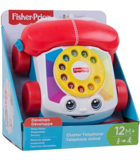 Fisher Price Chatter Phone är en klassisk leksak som med roliga funktioner, ringljud och sitt snälla utseende har blivit en favorit för barn i flera generationer. Lyft på luren och prata, vrid på snurrskivan eller dra telefonen efter dig och se hur ögonen rör sig upp och ner. Här får barnet öva på sin finmotorik, siffror, färger och att prata. Telefonen fungerar både som en aktivitetsleksak och dragleksak. Mått: ca 16x17x9 cm Rekommenderad ålder 12m+ ...