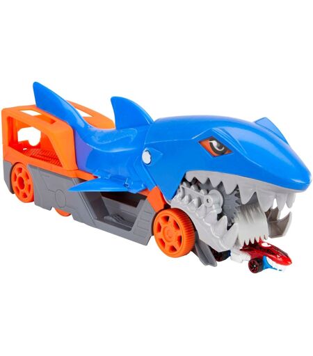 Dette køretøj vækker det klassiske Shark Bite-legetøjskøretøj fra Hot Wheels til live igen. Takket være en speciel tyggemekanisme, der aktiveres ved at skubbe køretøjet, griber den sultne hajtransportør et køretøj direkte med munden og holder det i maven. Tømning påkrævet? Der er en let tilgængelig udgangsrampe på bagsiden. Dette køretøj leveres med et køretøj i skala 1:64 og kan rumme op til fire andre køretøjer (sælges separat). Med denne glubske hjælp er oprydning virkelig sjovt for børn fra fire år. ...