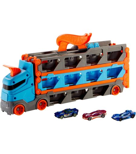 Hot Wheels Speedway Hauler omdefinerer Hot Wheels-opbevaring og -racerløb med en sej lastbil, der er fuld af overraskelser. De små vinduer på traileren viser de mere end 20 Hot Wheels-biler, den kan opbevare, og når børnene trækker lågen op, bliver lastbilen til en 180 cm lang racerbane. Biler, som ikke bruges, forbliver synlige under banen, mens lastbilens førerhus bliver til en dobbeltaffyrer, som sender to biler ud i en episk kamp. Vinderen fortsætter til det næste eventyr med baner, der kan forbindes til andre Hot Wheels City-sæt (sælges separat). Det multifunktionelle køretøj kommer med tre Hot Wheels-biler i skala 1:64 og kan indeholde 20 mere (sælges separat). Det giver endeløs leg for børn i alderen 4 til 8 år. Farver og mønstre kan variere. ...