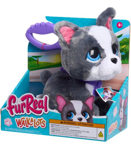 Det har aldrig været mere sødt at passe et kæledyr end med dette interaktive legetøj fra Just Play. Walk-A-Lots French Bulldog fra serien furReal er en grå og hvid, interaktiv hund, der altid er klar til en gåtur. Fastgør den medfølgende snor til hvalpens halsbånd, og tag den med på en gåtur rundt i huset med en blid skubbebevægelse. Han bevæger sig med en hoppende gang og et vippende hoved. Dette yndige, 20 centimeter høje børnelegetøj laver søde hvalpegøen og andre lyde, når den bevæger sig. Efter gåturen kan børnene nusse, klappe og pleje deres hund. ...
