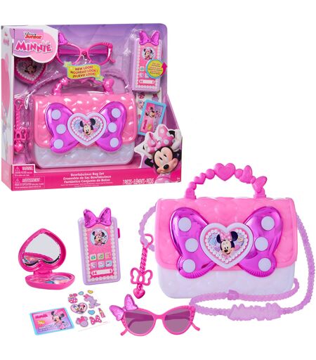 Disney Junior Minnie Mouse håndtaske legesættet fra Just Play indeholder alt, hvad små fashionistaer har brug for for at ledsage Minnie Mouse og Daisy Duck på alle deres eventyr. Den 18,6 cm høje taske har en stor sløjfe med en speciel kromlignende finish for et ekstra luksuriøst look. Indeni er der en legetøjsmobiltelefon med lys- og lydeffekter, lyserøde legetøjssolbriller, en legetøjspudderkasse, et legetøjskreditkort, en nøglering og et klistermærkeark. Når der trykkes på knappen på legetøjsmobiltelefonen, afspilles sjove ordsprog fra Minnie Mouse. Alt medfølgende tilbehør kan opbevares i tasken. Takket være den behagelige skulderrem er tasken nem at tage med dig. ...