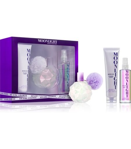 Ariana Grande Moonlight, , Sæt til kvinder til kvinder , Specielle lejligheder kræver specielle gaver, hvad enten du vil gøre dig selv glad eller glæde dem, du holder af. Gavesættet Ariana Grande Moonlight indeholder en omhyggeligt udvalgt kombination af dufte og skønhedsprodukter, der er sammensat med kærlighed. De vil med garanti fremtrylle et smil på læberne hos dig eller dine kære, uanset om du kaster dig ud i at prøve dem med det samme, eller om du vil åbne dem lidt efter lidt i løbet af en hel måned. Egenskaber: parfumekosmetikken forlænger duften sættet indholder duft og kosmetiktilbehør fra samme kollektion Sættet indeholder: Eau de Parfum 100 ml Kropsspray 118 ml Krops souffle 100 ml ...