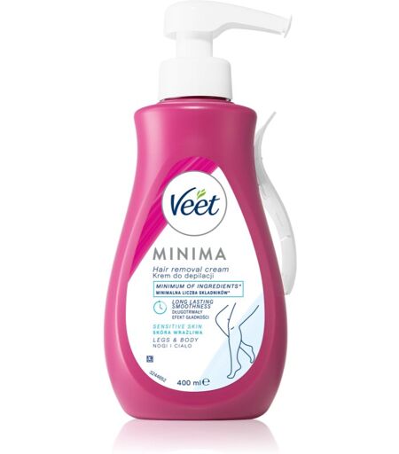 Veet Minima Sensitive Skin, 400 ml, Hårfjerning og epilering til kvinder , Vil du gerne slippe af med uønskede hår på kroppen, men passer hverken hårfjerning med voks eller klassisk barbering med barberblad dig ikke? Produktet Veet Minima Sensitive Skin gør det muligt for dig at fjerne hårene hurtigt, effektivt og smertefrit, og under hårfjerningen vil det desuden blødgøre hårene, så de bliver generelt svækkede, når de vokser igen. Du skal blot dække huden jævnt med det, vente nogle minutter og så simpelthen fjerne det med spartlen. Resultatet bliver en helt glat hud, som du ikke skal depilere eller epilere igen i længere tid, end hvis du havde barberet dig med et barberblad. Egenskaber: fjerner skånsomt håret over flere uger kan også bruges til korte hår Brugsvejledning: Følg vedlagte manual. ...