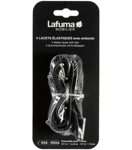 Lafuma Futura Set of Elastic Laces L: 140 cm - Noir Udskiftningssæt til hvilestole fra Lafuma i modellerne RT, RSX og RSXA hvilestol. Med elastikkerne kan du nemt fikse din hvilestol. Sættet, som indeholder elastikker til én hvilestol, består af to elastikker på 140 cm samt to elastikker på 60 cm. Designer: Lafuma Mål: Længde: 140 og 60 cm ...