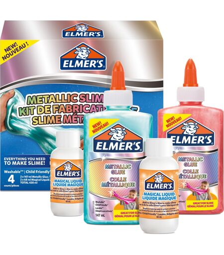 Elmer’s Metallic Slimsæt Dette kreative DIY slimsæt indeholder 2 hobbylim med en flot skinnende metallic shine i blå og pink, plus 2 klassiske slimaktivatorer, så du frit kan slippe kreativiteten løs og mikse og matche den perfekte slim med spændene og sjove metalliceffekter. Med sættet kan du lave uanede mængder af fantasifulde slimkreationer og er sikret timevis af kreativ leg og læring. All-in-one formel til hjemmelavet slim Vaskbar for hurtig og nem rengøring Ingen giftige stoffer Fantastiske metalliceffekter Timevis af kreativ udfoldelse Hobbylim + magical liquid = hjemmelavet slim Med Elmer's lim og magical liquids er der ingen grænser for dine ideer til slim kreationer. Elmer’s hobbylim er børnevenlig, vaskbar og forbliver fleksibel, når den er tør - til hurtig og nem rengøring. Og takket være Magical Liquid behøver du ikke tilføje kontaktlinsevæske, bagepulver eller andre tilsætningsstoffer. På denne måde kan limen hurtigt og let omdannes til den perfekte slim. Legeslim med glitredne metalliceffekt Metallic slimsættet indeholder alt hvad du behøver for at skabe skinnende metallisk slim. Hobbylimen med en har en flot og skinnende metalliceffekt med en glasfuld og glitrende shine som giver en utrolig flot og effektfuld slim. Kombiner limen med de medfølgende magical liquids, for ubegrænset kreativitet og masser af sjov - kun fantasien sætter grænser! Elmer’s Metallic Slimsæt indeholder: 2 x Elmer's Metallic Glue (blå og pink) 2 x Magical Liquid OBS! Ikke egnet til børn under 3 år Brug kun under opsyn af voksne. Vask hænder grundigt før og efter fremstilling såvel som før og efter leg med slim. ...